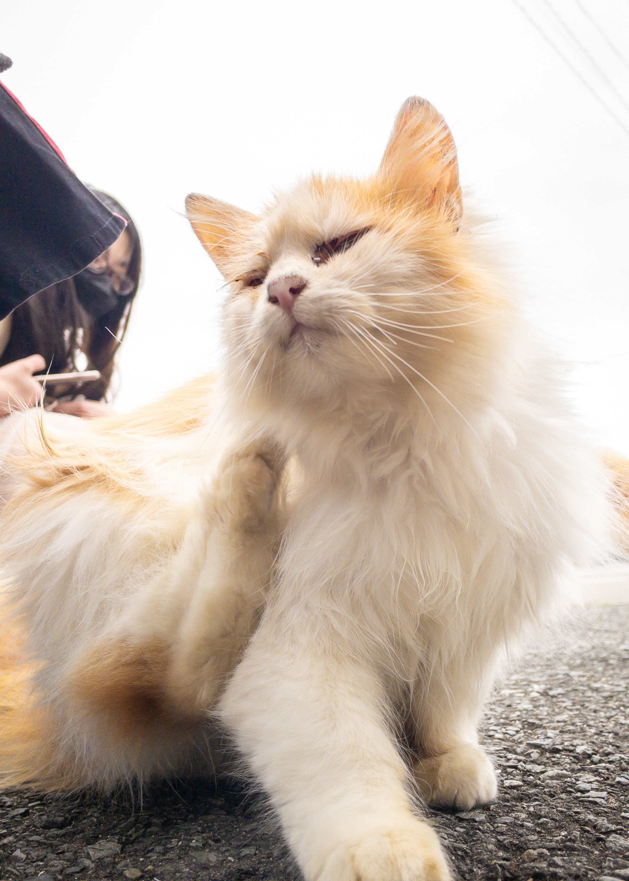 人間の近くで毛づくろいする猫