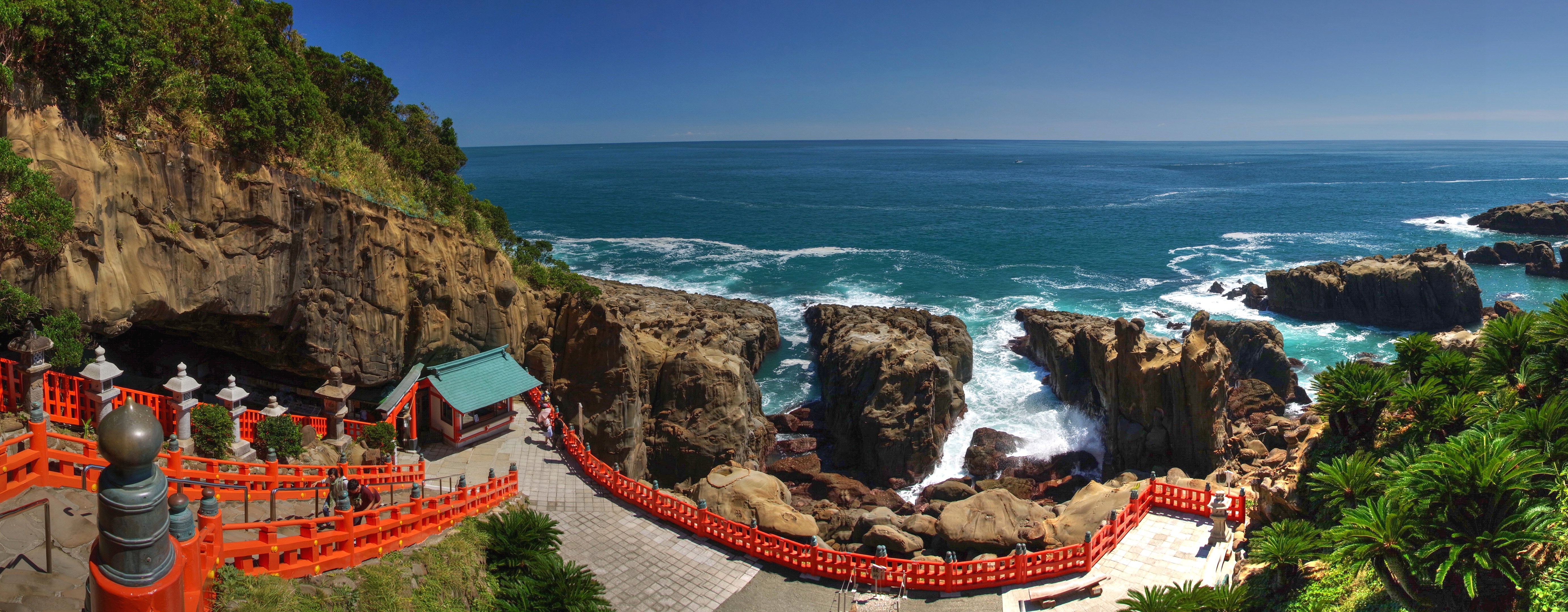 「鵜戸神宮」鵜戸崎岬の突端にある洞窟の中に朱塗りの御本殿が鎮座している珍しい神社です。縁結び、安産、育児、海上安全などのパワースポットとしても有名でたくさんの観光客でにぎわっています。初めて行ったとき崖の上にあり、海からの風がしていたり岩に荒波がぶつかり波の音が気持ちがいい場所でした。