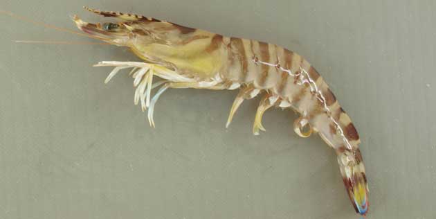 熊本県の県魚。淡い褐色の地に青褐色の縞模様があり、体を丸めると車輪のように見えることからクルマエビと呼ばれる。全国的に熊本県産のものは有名。 全長20~25cm。