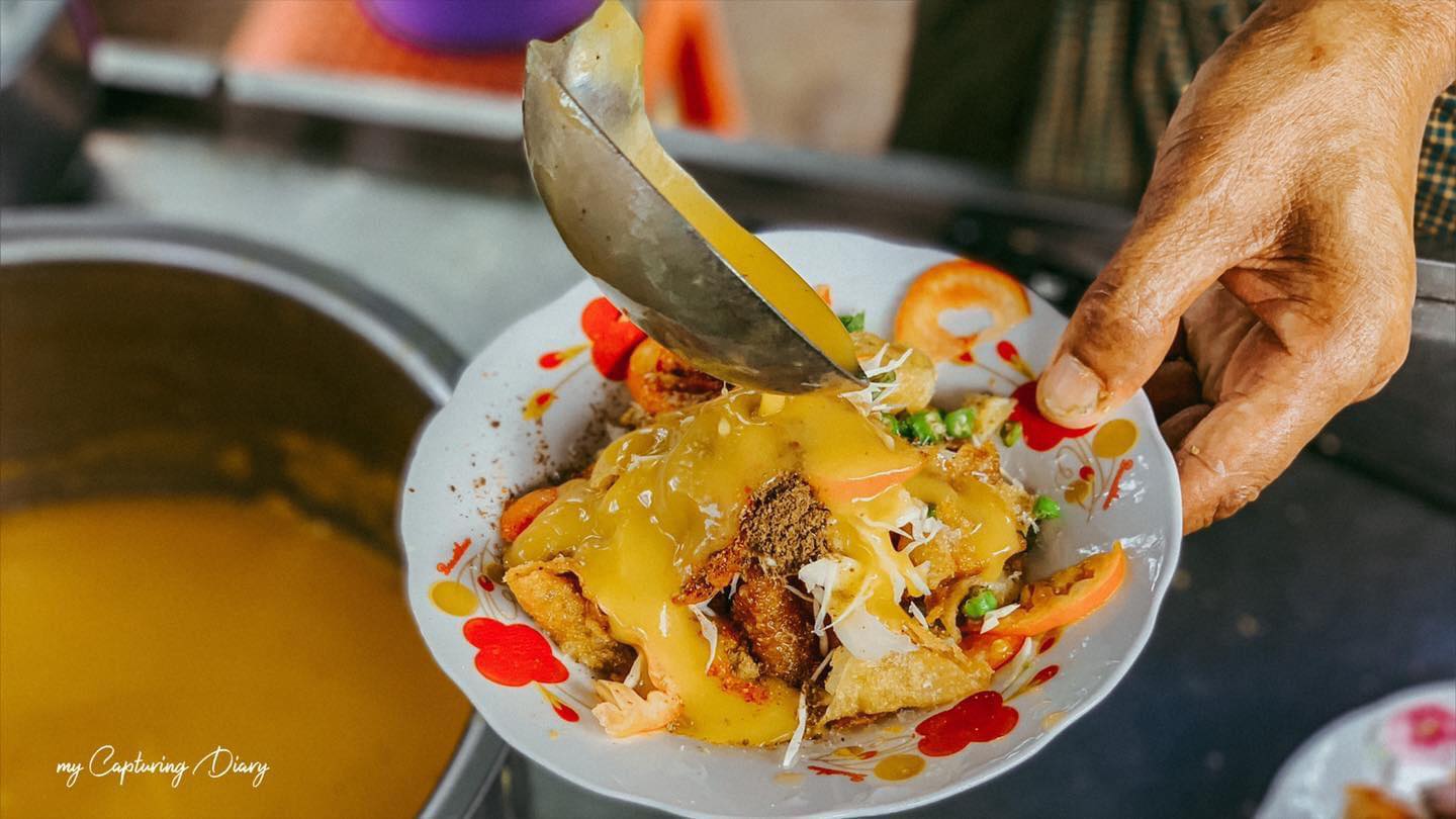 MonHinKha-->ミャンマーの一番人気がある朝食、天ぷらとかあげとかと細い面とスープが入ってます。