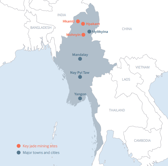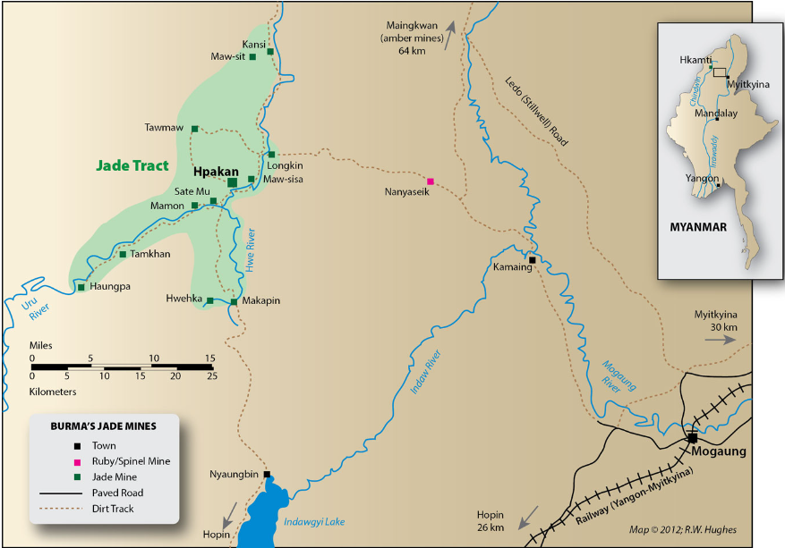 Hpakant is the center of the jadeite mining district (or central Jade Tract) in north-central Myanmar(Burma). The major jadeite mines are roughly enclosed east and west by the Uru (Uyu) and Chindwin rivers, between the 25th and 26th parallels of latitude, within Kachin State.