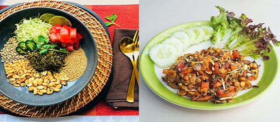 leaves are mixed by hand with shredded cabbage, sliced tomatoes, crunchy deep-fried beans, nuts and peas, a splash of garlic oil and pungent slices of chili and garlic. Laphet Thoke is the most popular Myanmar food